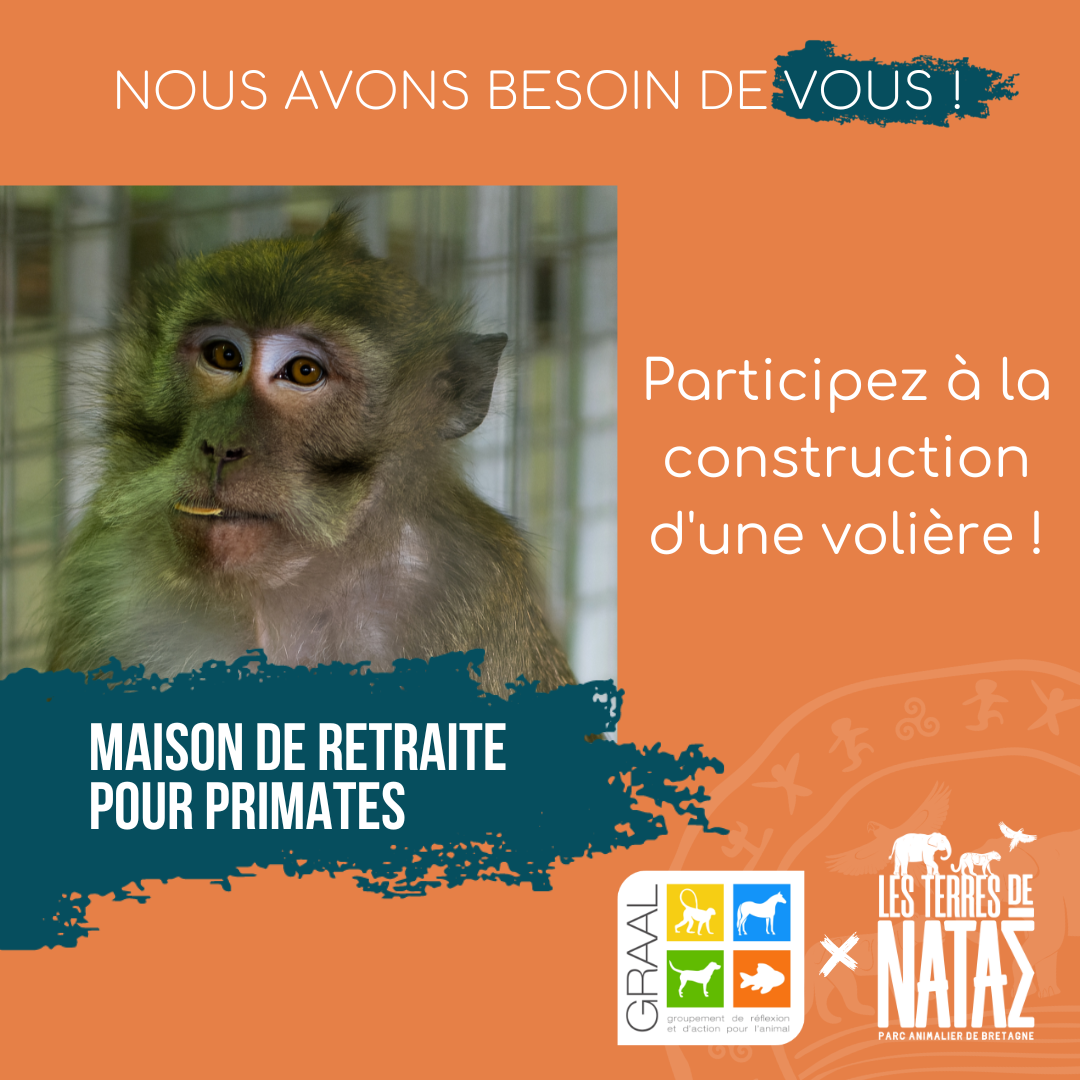 Afin d’éviter l’euthanasie à de nombreux primates sortant des unités de recherche, le GRAAL et les Terres de Nataé ont pour projet de leur construire une « Maison de retraite pour primates », une volière de plus de 500m2, sur plusieurs niveaux associés à un bâtiment dédié, une zone arborée, un bassin et un espace modulaire pour permettre des mises en contact progressives au gré des arrivées des animaux.