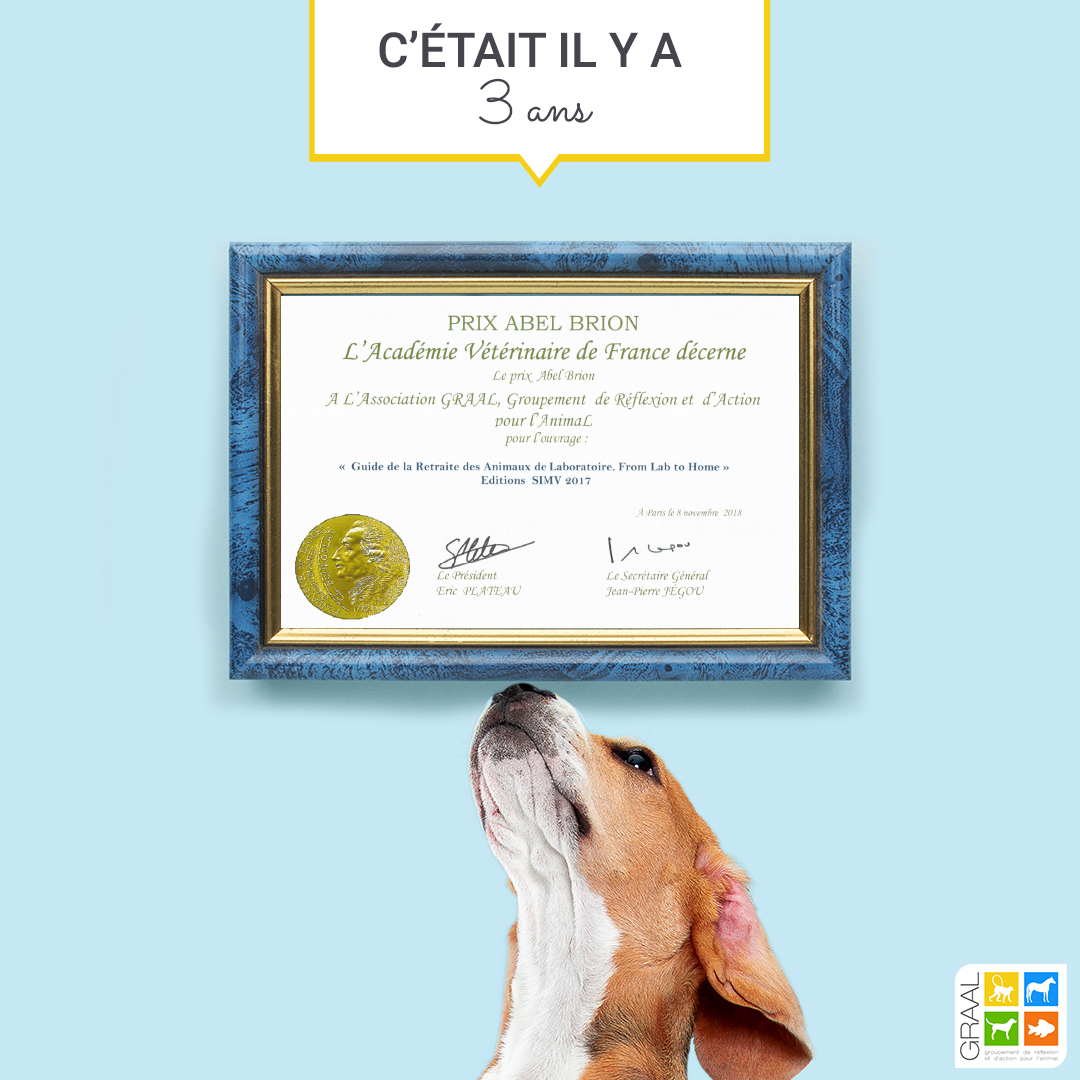 Le jeudi 8 novembre 2018, en l’Hôtel de l’Académie Nationale de Médecine, au cours de la séance solennelle de l’Académie Vétérinaire de France, le « Guide de la Retraite des Animaux de Laboratoire. From Lab to Home », rédigé par le GRAAL, recevait le prix Abel Brion. Le prix est attribué à l’ouvrage au titre des publications remarquées à caractère environnemental et/ou de santé publique.