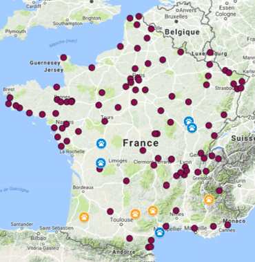 Les refuges du Sud de la France sont à l’honneur pour accueillir les chiens (en orange sur la carte). En bleu, les refuges accueillant les NACs et les cochons. Leur point commun : ils sont tous en bonne santé et sont prêts à débuter leur nouvelle vie !